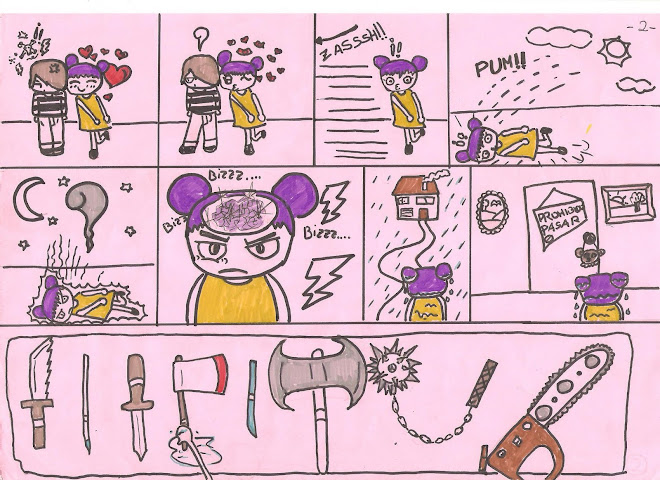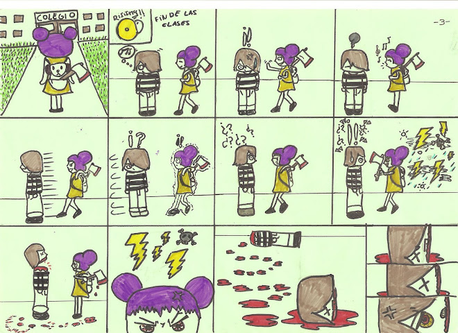 -Referencia: Empece a hacer el comic por Quino (creador de mafalda) que siempre me gustó, pero tambien tiene influencias de los mini cortos de Pucca, por la historia de amor y rechazo entre los personajes, el resto de la historia (el asesinato, la niña psicopata y el chico quese combierte en zombie) es de mi cosecha.
